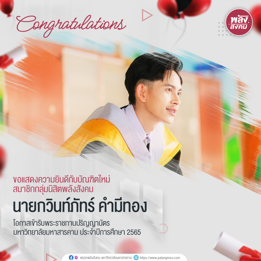 วันนี้คือวันที่ความพยายามและความมุ่งมั่นของพี่ ๆ บัณฑิตที่ได้รับผลตอบแทน การสำเร็จการศึกษานั้น ไม่เพียงแต่เป็นการปิดฉากบทหนึ่งของชีวิต แต่ยังเป็นการเริ่มต้นบทใหม่ที่เต็มไปด้วยโอกาสและความท้าทาย พี่ ๆ ทุกคนคือความภาคภูมิใจของพวกเรา ครอบครัว อาจารย์ และสถาบัน ขอให้ความรู้และประสบการณ์ที่ได้รับตลอดระยะเวลาที่ผ่านมาเป็นพลังในการสร้างสรรค์สิ่งดี ๆ ให้กับสังคม ขอให้มีความมั่นใจในศักยภาพของตนเอง และก้าวเดินไปสู่ความสำเร็จอย่างมั่นคง