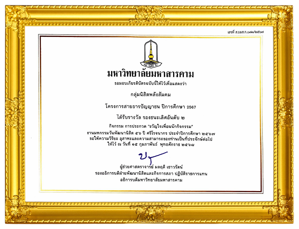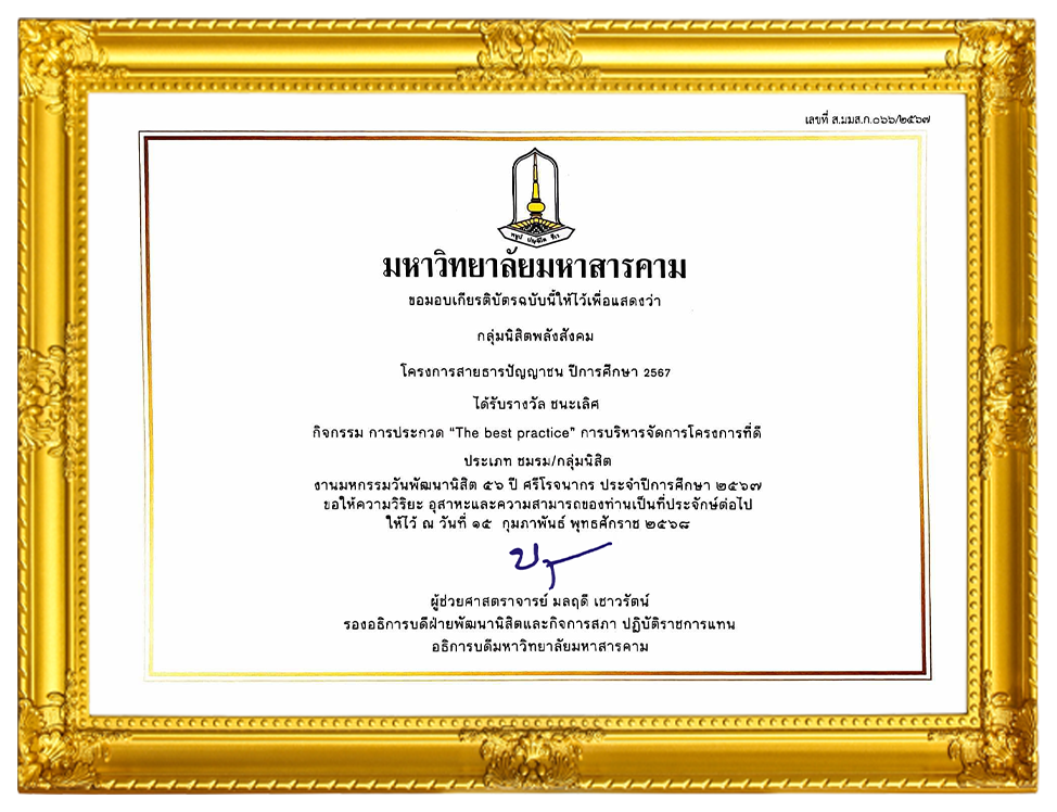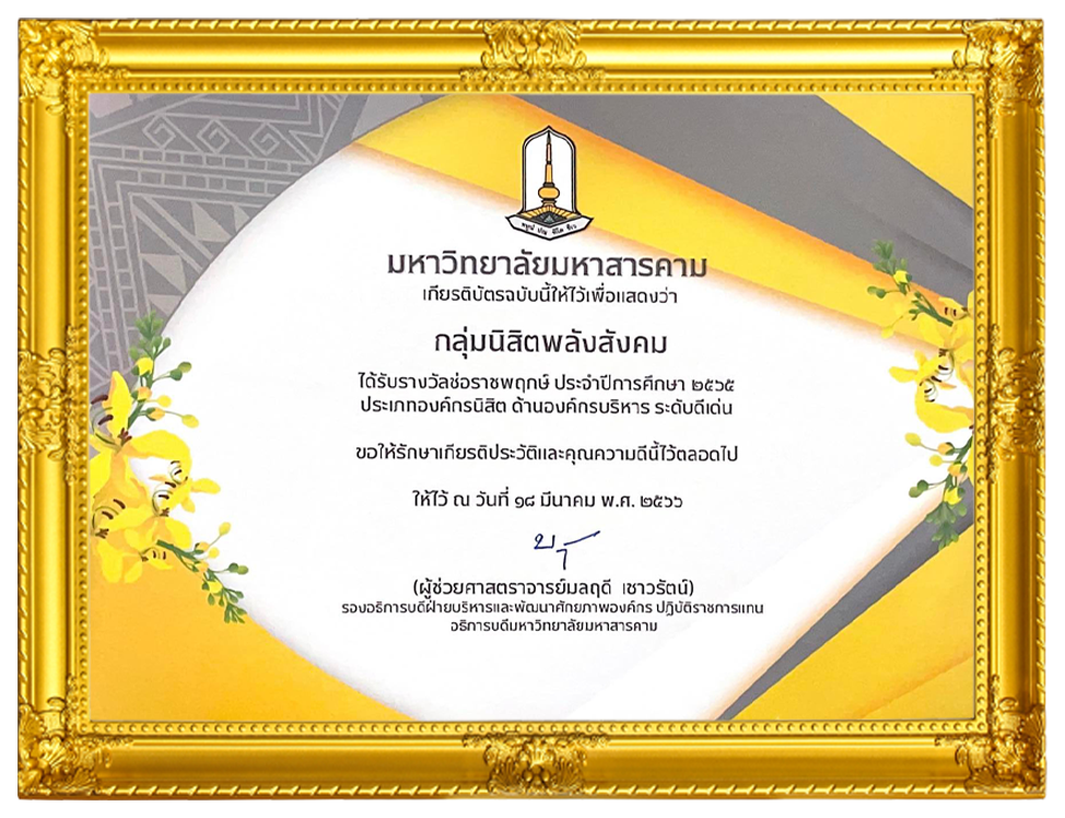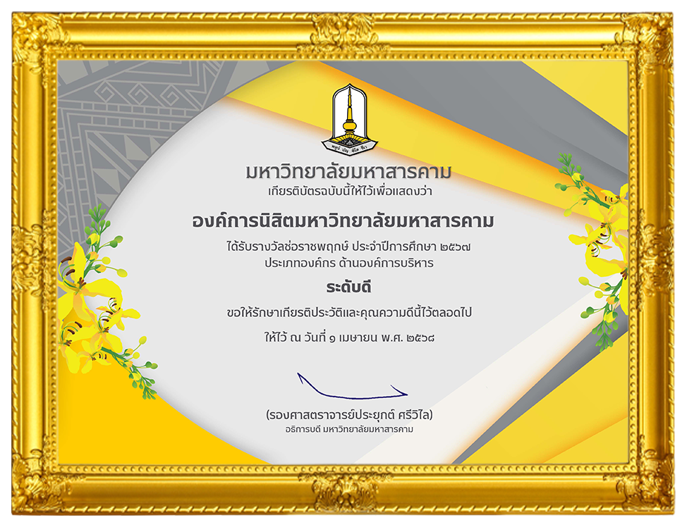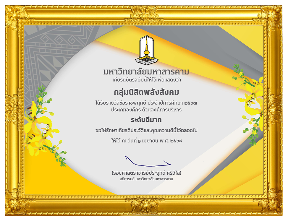 องค์การนิสิต มหาวิทยาลัยมหาสารคาม ปีการศึกษา 2567 บริหารงานโดย กลุ่มนิสิตพลังสังคม ได้รับรางวัลช่อราชพฤกษ์ ประจำปีการศึกษา 2567 ประเภทองค์กร ด้านองค์กรบริหาร ระดับดี