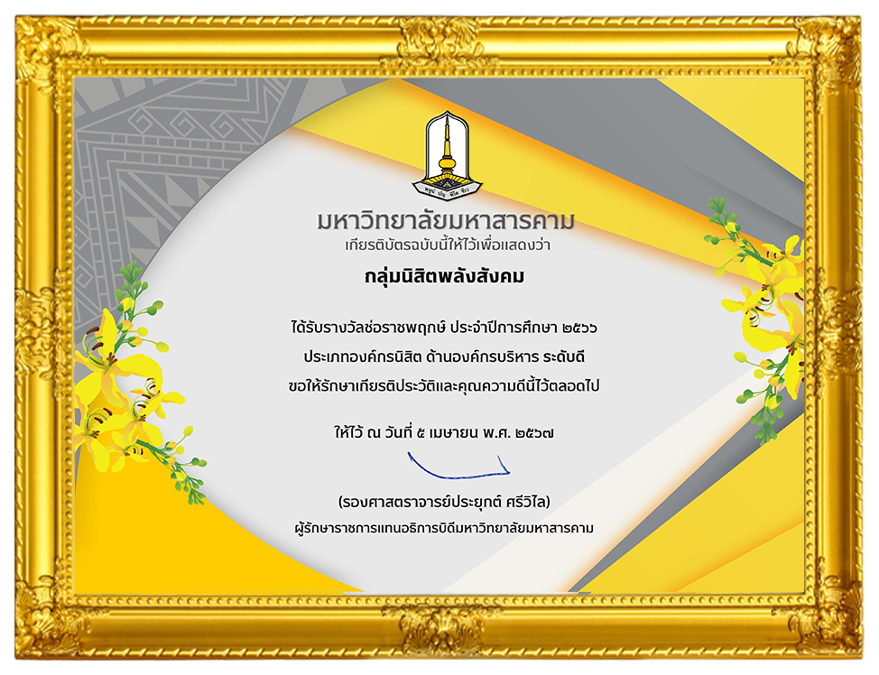 องค์การนิสิต มหาวิทยาลัยมหาสารคาม ปีการศึกษา 2567 บริหารงานโดย กลุ่มนิสิตพลังสังคม ได้รับรางวัลช่อราชพฤกษ์ ประจำปีการศึกษา 2567 ประเภทองค์กร ด้านองค์กรบริหาร ระดับดี